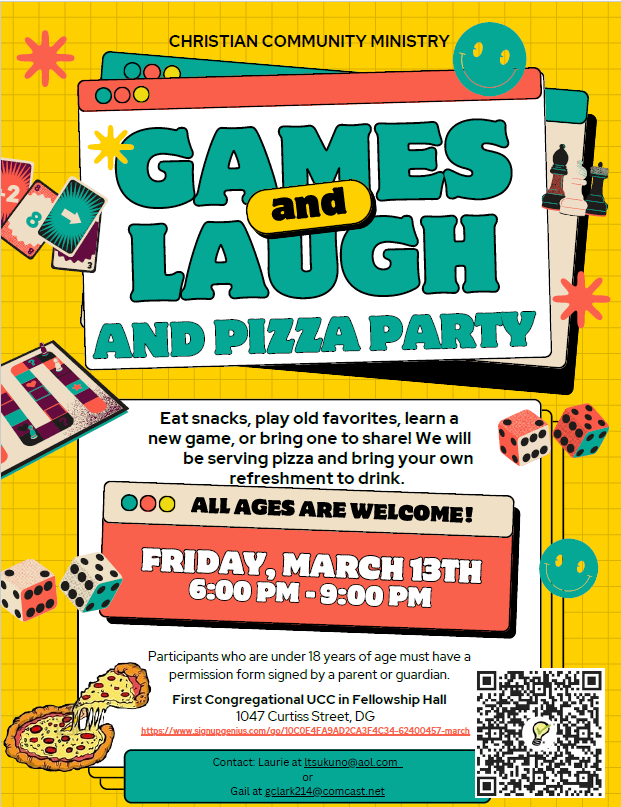Come on out for FUN, FOOD and GAMES at the Christian Community Ministry sponsored Game Night! We’ll provide pizza and it’s BYOB. Please sign up by Mar. 10. (We will be taking a free-will offering to cover the cost of the pizza).
