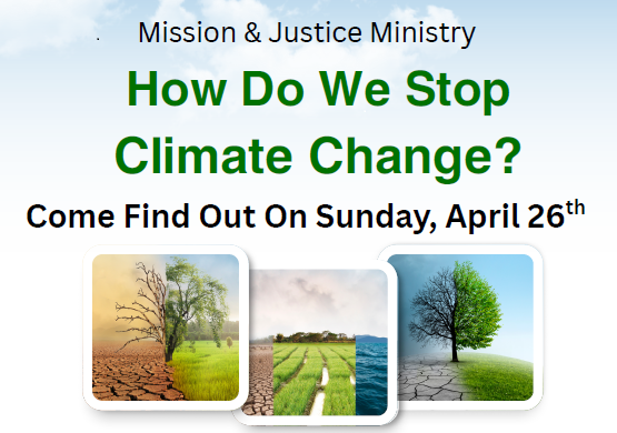 Join the Mission & Justice Mission for this fun, interactive session! We’ll be joined by a presenter from Citizen’s Climate Lobby to help us brainstorm ideas about what we can do, as individuals and as a community, to help stop climate change! Lunch is incluced!
