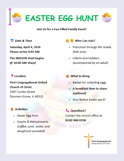 All preschool through 6th grade children are welcome to join us for this fun-filled family event! Bring a basket for collecting eggs and a breakfast item to share. The INDOOR hunt begins at 10 a.m. sharp! Don’t be late as the hunt goes quickly and you don’t want to miss out on the fun!